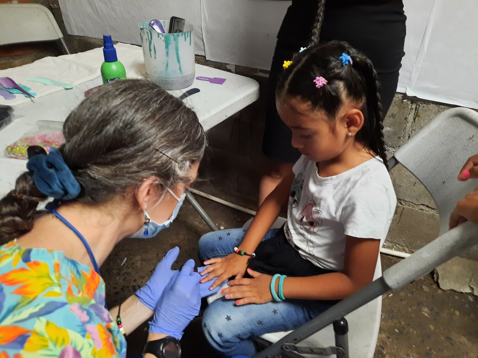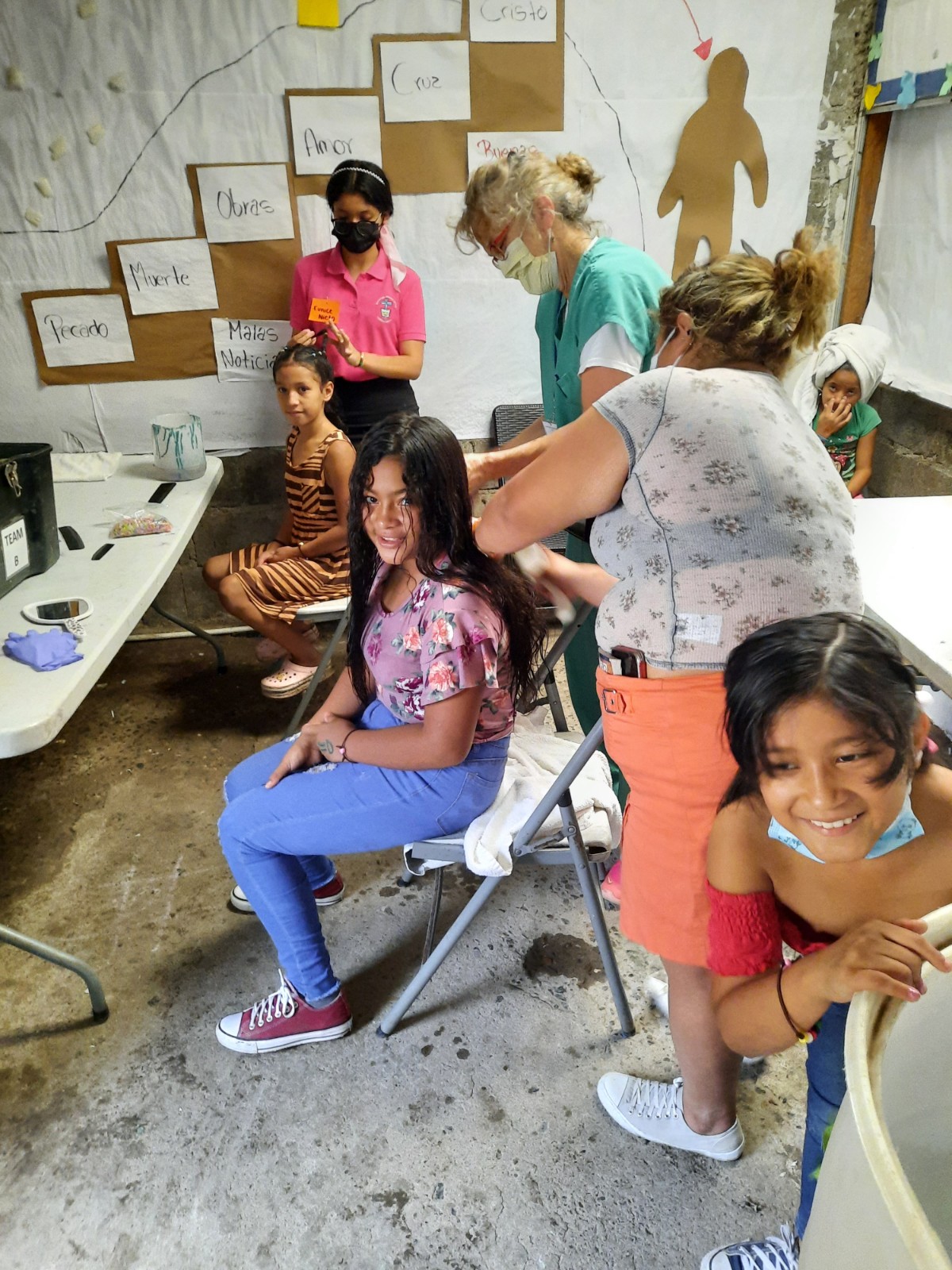 We conducted mobile clinics for two days each in two different churches. These clinics offered free medical care and medications to anyone who showed up. Our doctors and advanced practice nurses diagnosed patient problems, then patients were given the medications they needed at the pharmacy station. Everyone went through the evangelism stations before they left. The children went to our children’s ministry stations, where we sang songs, told the gospel story, and washed and styled their hair, even painting the fingernails of the little girls. Some special projects— installation of simple water filters in homes— were completed, as well. Each team member was rotated through the stations appropriate to their skills and experience levels. (Engineers— and we had some— weren’t assigned a doctor-role, for example!)